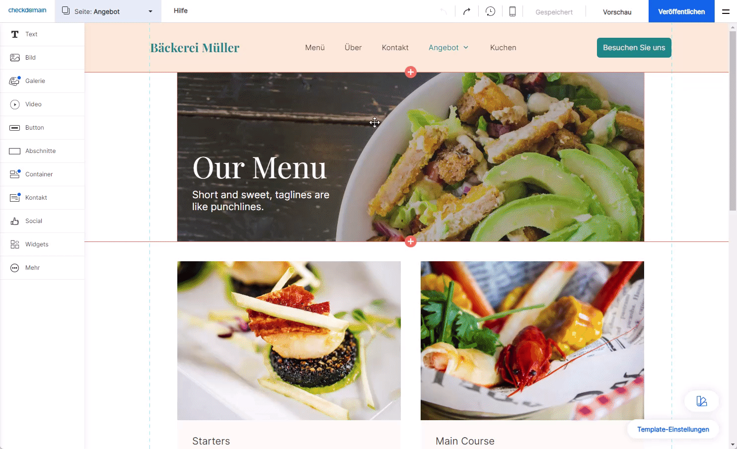 Im Websitebuilder-Editor finden Sie verschiedene Komponenten und vorgefertigte Abschnitte, die Sie an die gewünschte Stelle auf Ihrer Seite ziehen können. Sie können unter anderem hinzufügen: