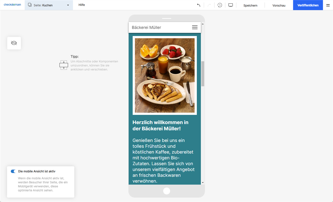 Ihre Website muss natürlich nicht nur am Computer gut aussehen. Mit der Funktion Mobile Ansicht können Sie Ihre Website für die Anzeige auf mobilen Geräten bearbeiten und vor der Veröffentlichung testen, wie sie aussehen wird.
