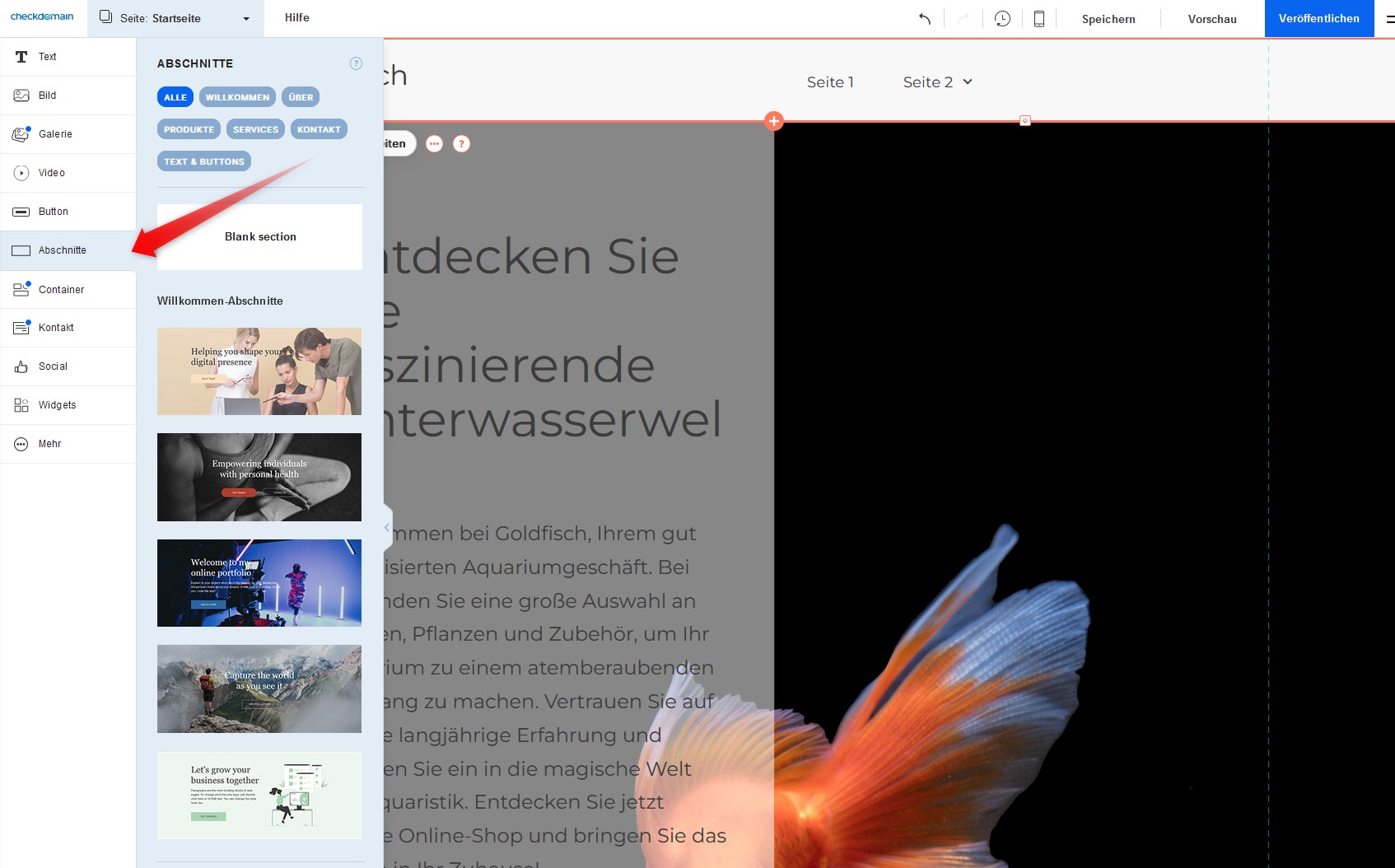 Sie finden die Abschnitte im Komponentenmenü auf der linken Seite Ihres Bildschirms. Blöcke sind unter Text und Kontakt verfügbar.