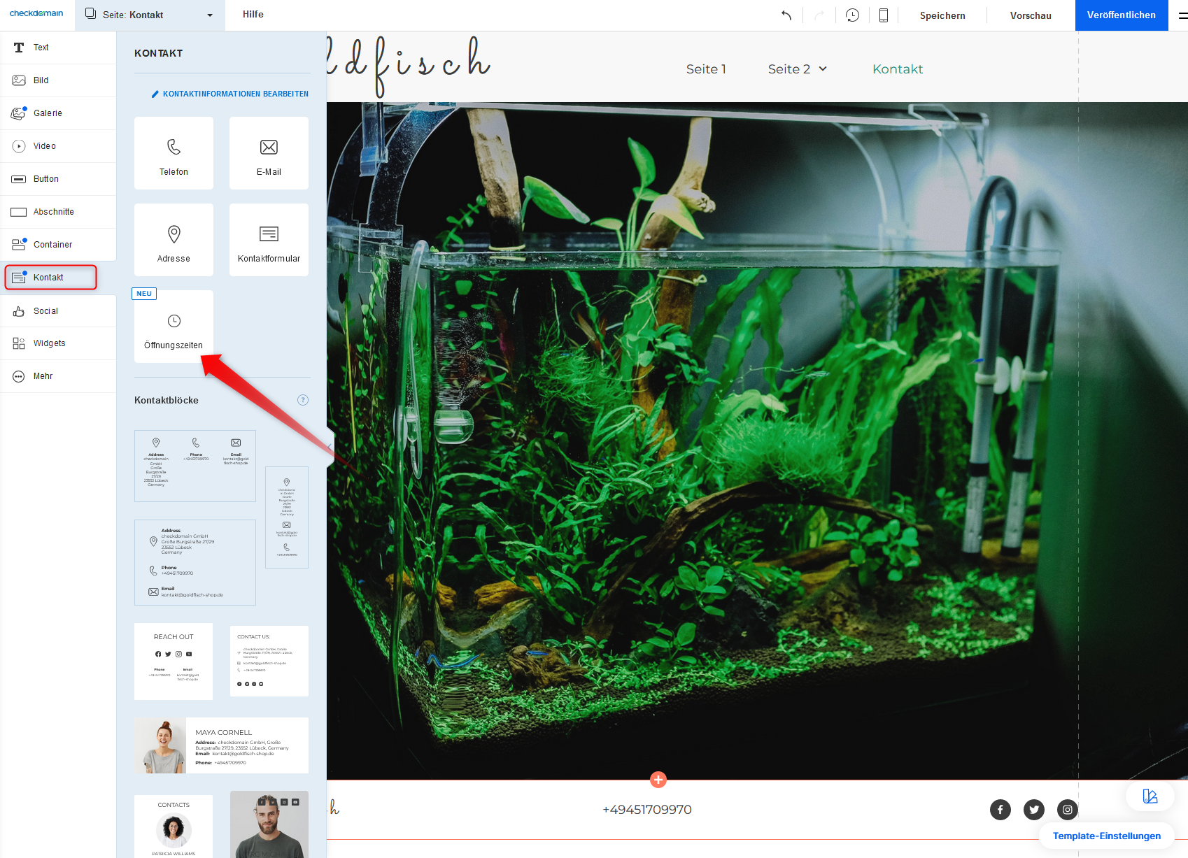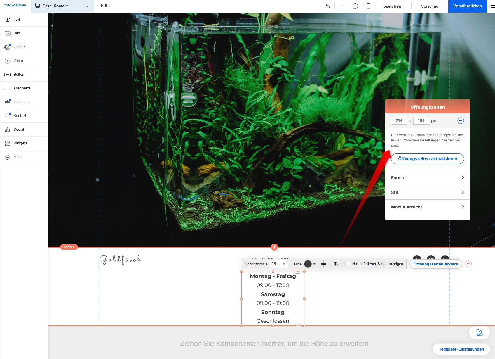 Hinweis: Wenn Sie möchten, dass Ihre Öffnungszeiten auf allen Seiten Ihrer Website angezeigt werden, empfehlen wir, diese in die Kopf- oder Fußzeile einzufügen.