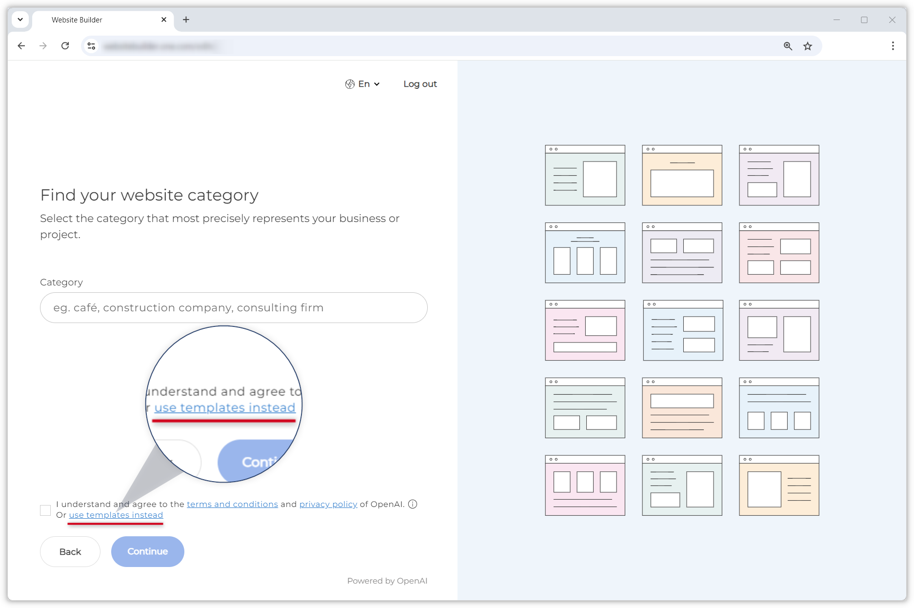 - Wenn Sie den Onboarding-Prozess noch nicht abgeschlossen haben, wählen Sie ein Template aus, anstatt dem KI-gesteuerten Einrichtungsablauf zu folgen. Klicken Sie dazu unten auf der ersten Seite der Einrichtung auf stattdessen Templates verwenden. Das Template muss mit dem auf Ihrer vorhandenen Website identisch sein. Wenn Sie Einstellungen in dem Template geändert haben, z. B. eine neue Schriftart, müssen Sie dies für Ihre neue Website erneut tun.