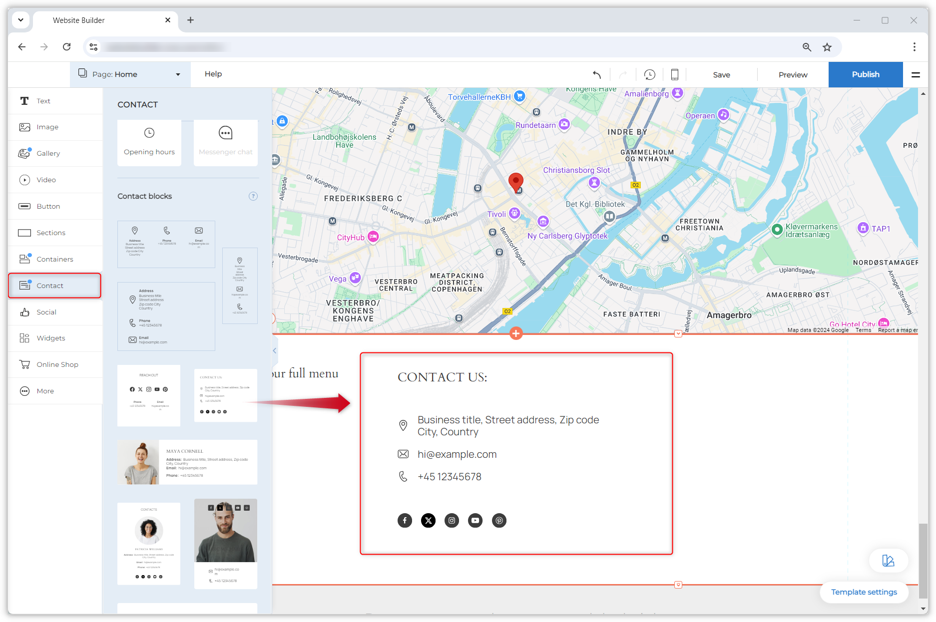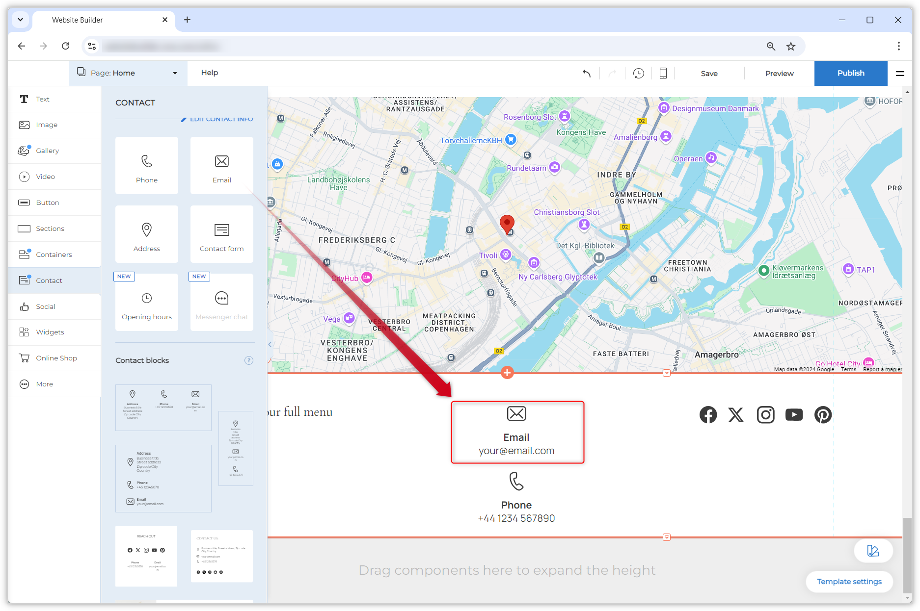 Nachdem Ihre Kontaktdaten nun in den Einstellungen Ihrer Website gespeichert sind, können Sie sie mithilfe der Kontaktkomponenten ganz einfach zu Ihrer Website hinzufügen.