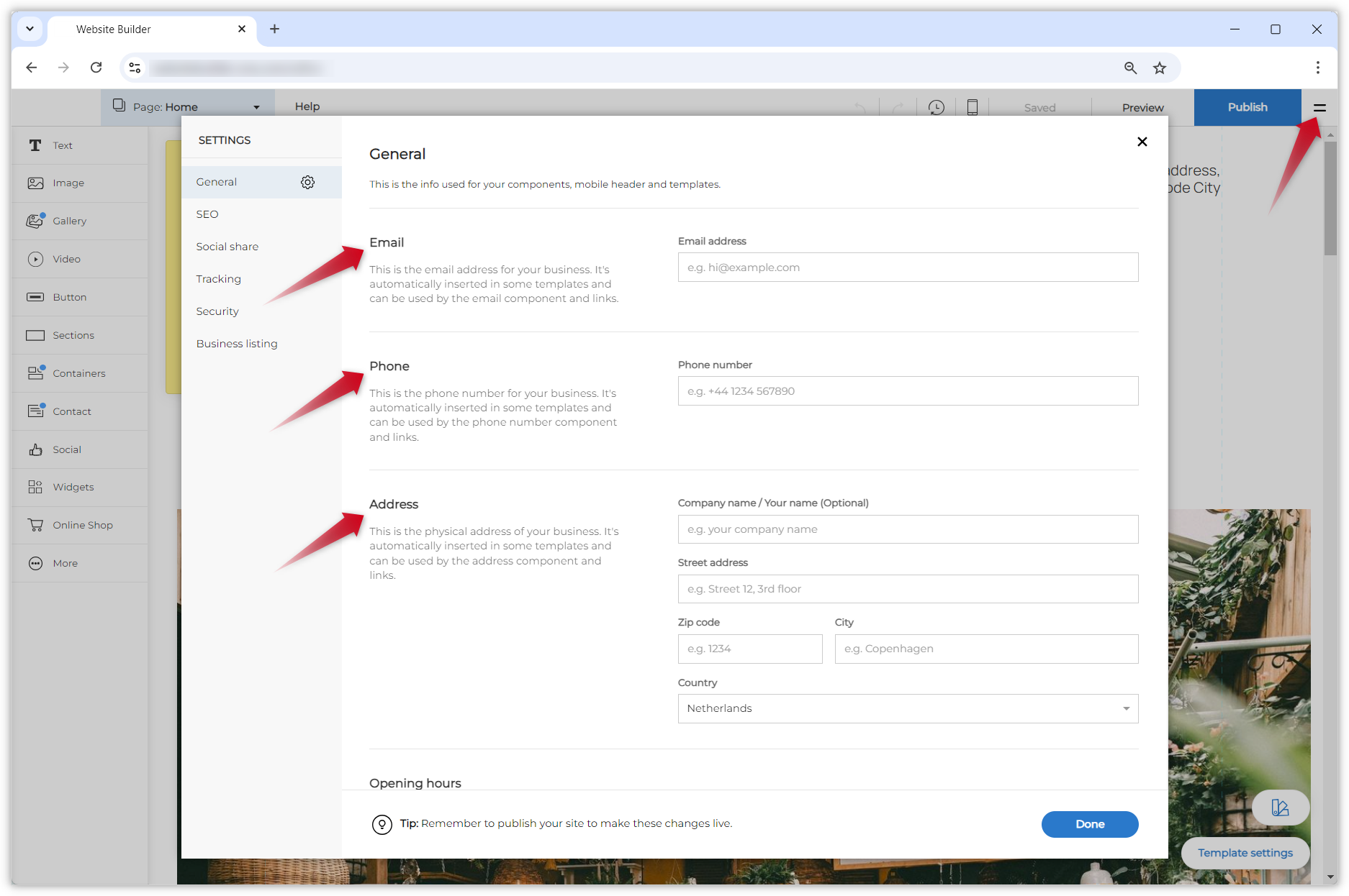 Sie können Ihre E-Mail-, Telefon- und Adressdaten in den Website-Einstellungen verwalten. Alle Änderungen, die Sie hier vornehmen, werden automatisch in allen Kontaktkomponenten Ihrer Website aktualisiert.