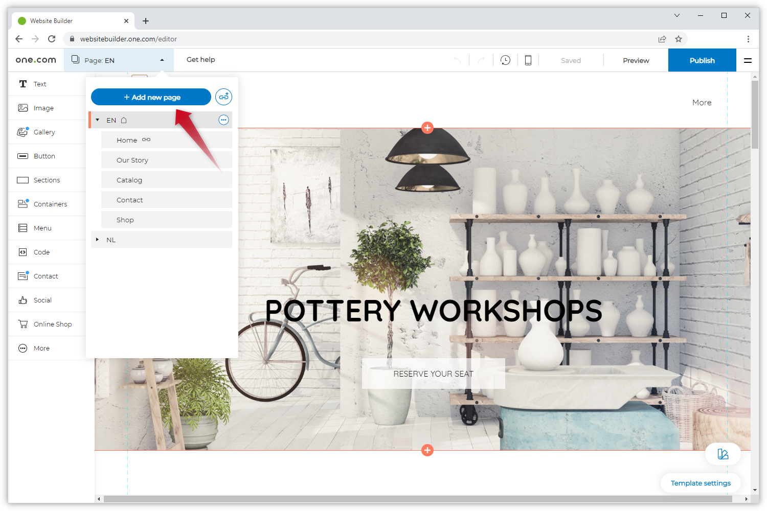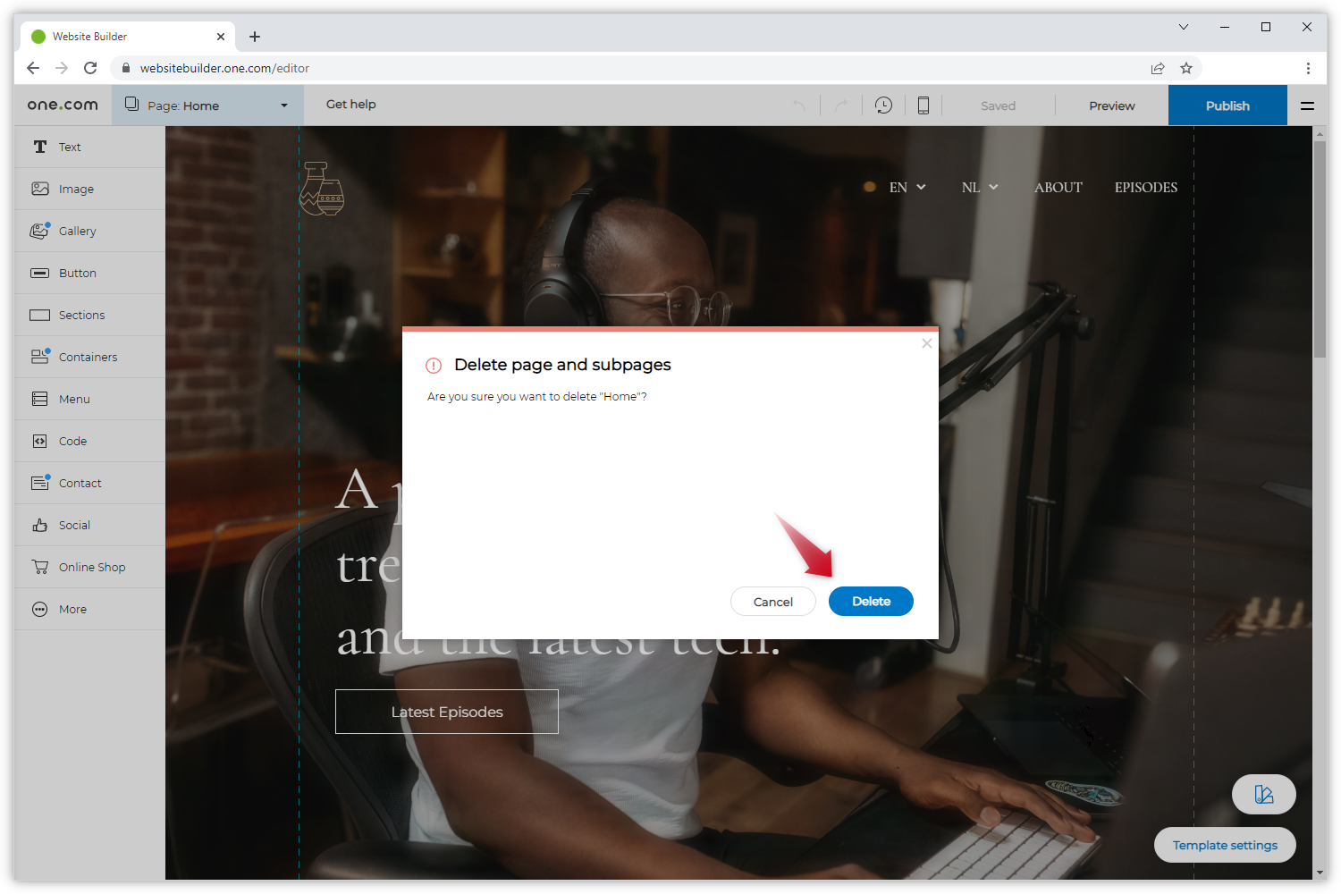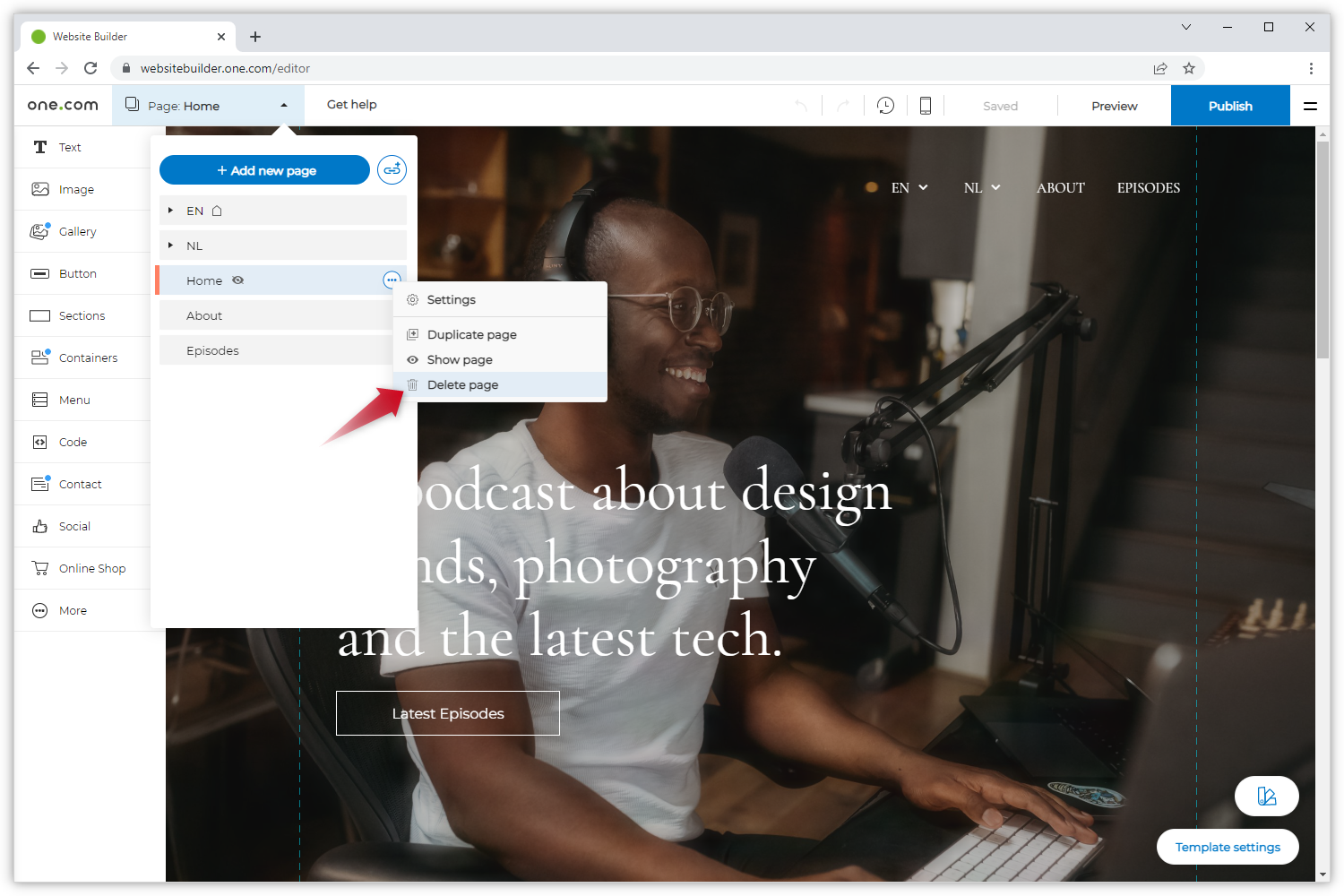 Sobald ein Template importiert wird, fügt der Websitebuilder automatisch Beispielseiten hinzu. Sie können diese über das Seiten-Menü einsehen und problemlos löschen.