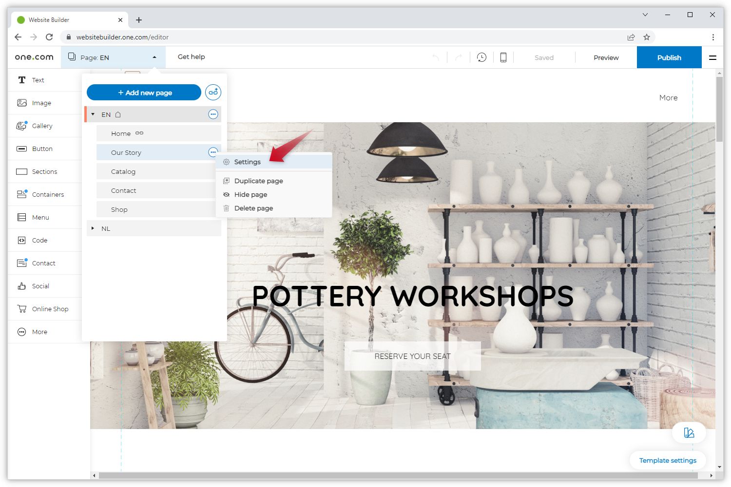 - Rechtsklicken Sie auf der Seite, bei der Sie das Template ändern möchten, und rufen Sie die Einstellungen auf.