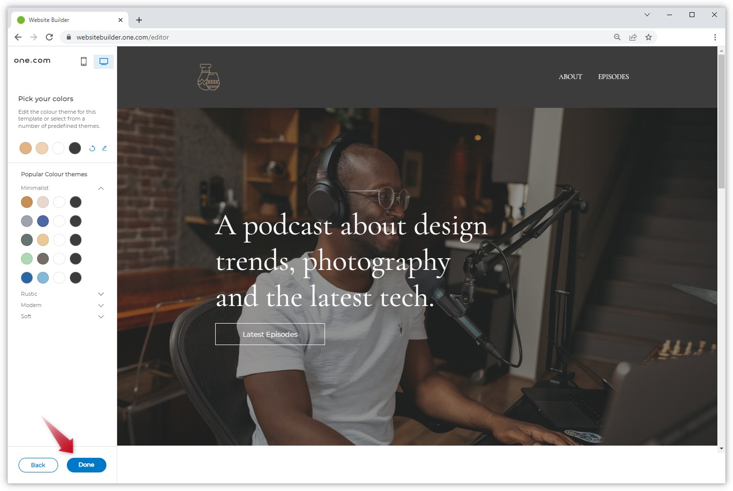 Wenn das Farbthema aktiviert ist, sehen Sie nur die Option Vorschau. Wenn Sie darauf klicken, werden in einem neuen Fenster das Template und das Farbthema auf der linken Seite angezeigt. In diesem Fall müssen Sie ein Farbthema auswählen und auf Fertig unten links auf der Seite klicken, um das Template zu importieren.
