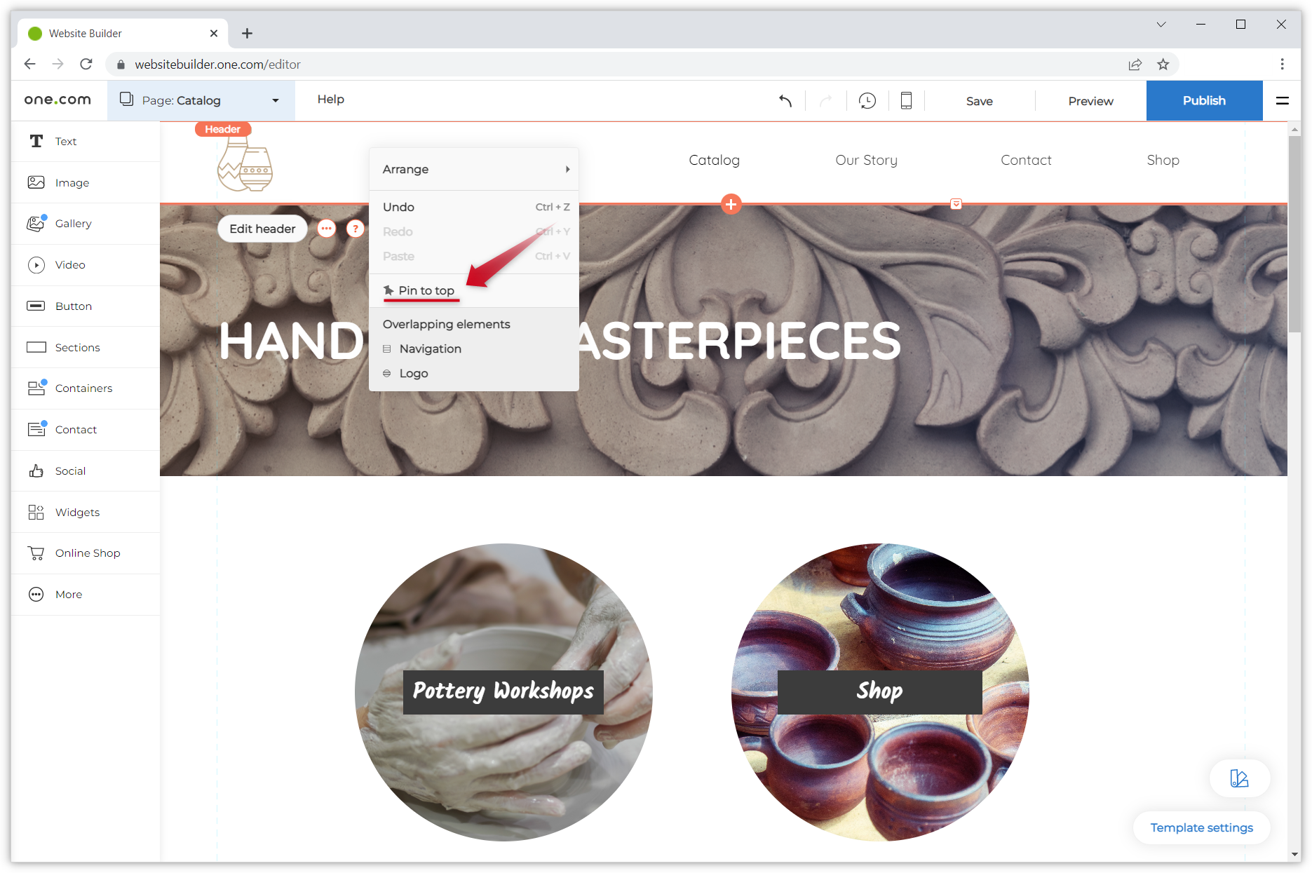 - Klicken Sie mit der rechten Maustaste auf Ihre Kopfzeile und wählen Sie im angezeigten Menü An den Seitenanfang anheften.